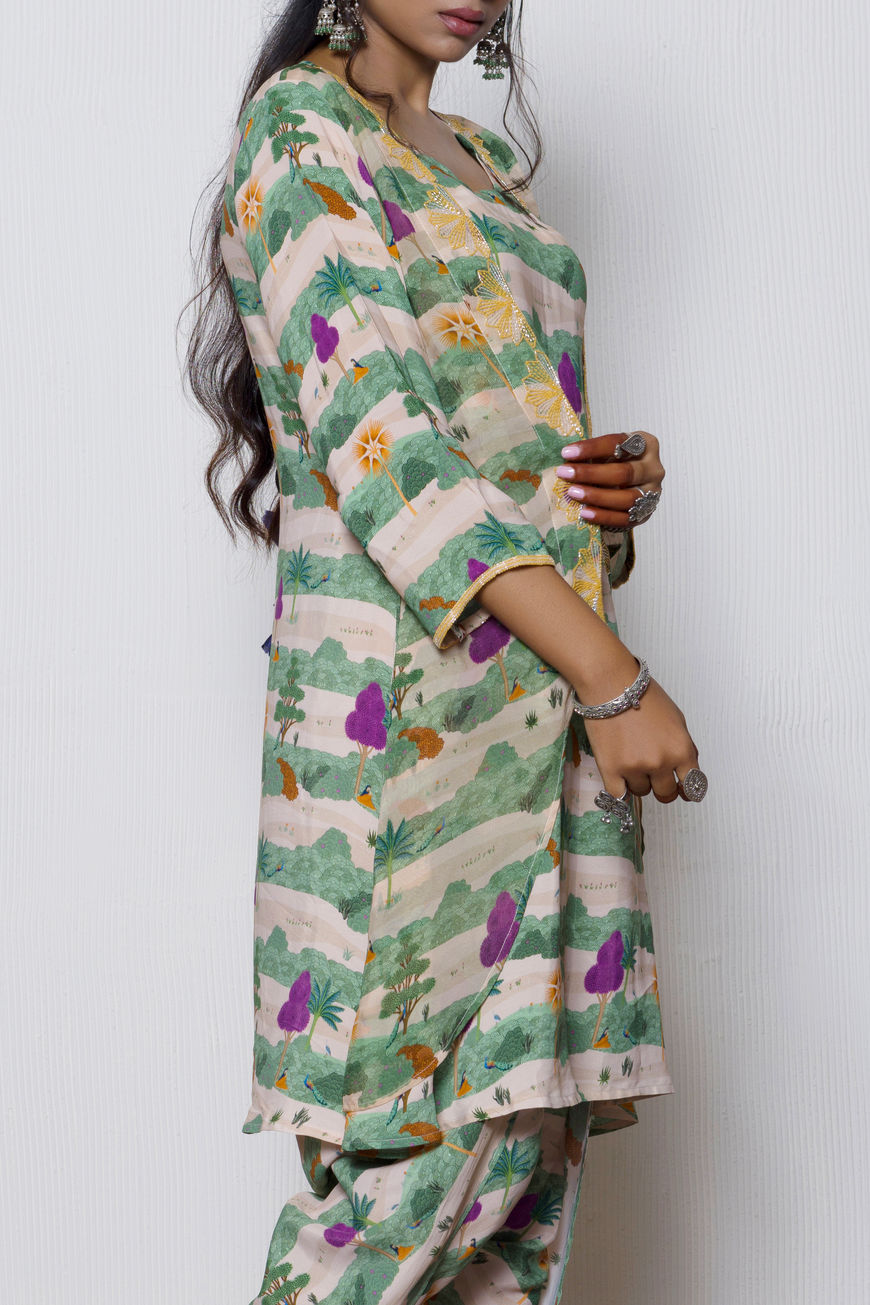 Irish Cream miniature print kurta with embroidered jacket flap and dhoti pants.